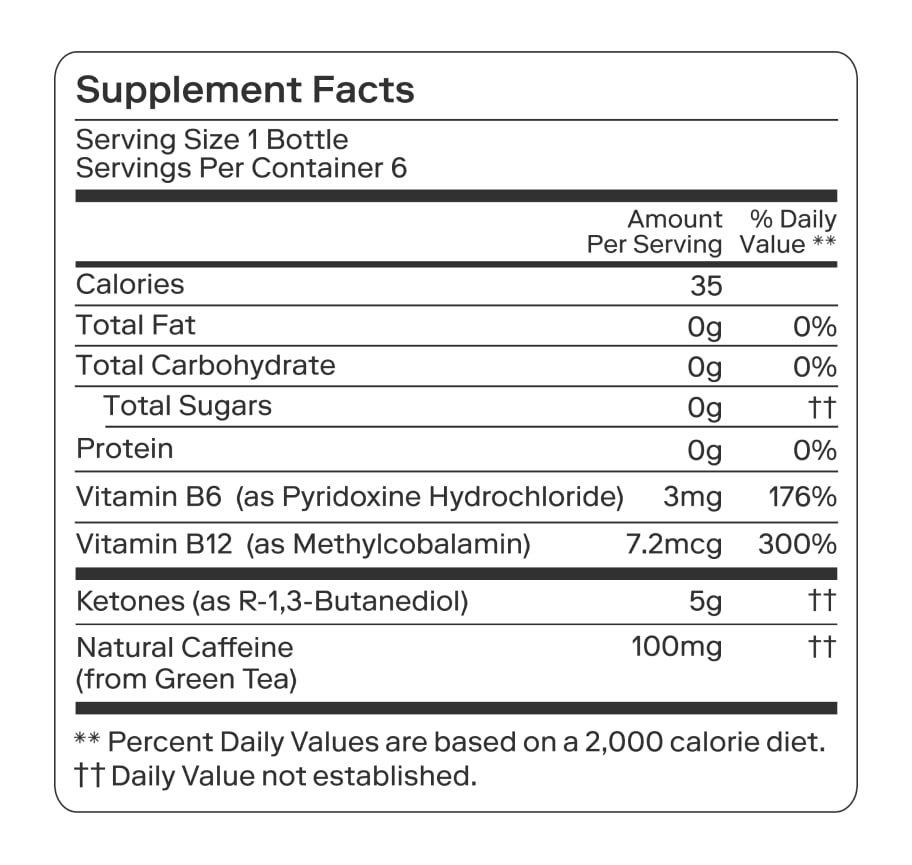 High performance energy from ketones, blended with natural caffeine from Green Tea; about the same amount of caffeine as 1 cup of coffee.